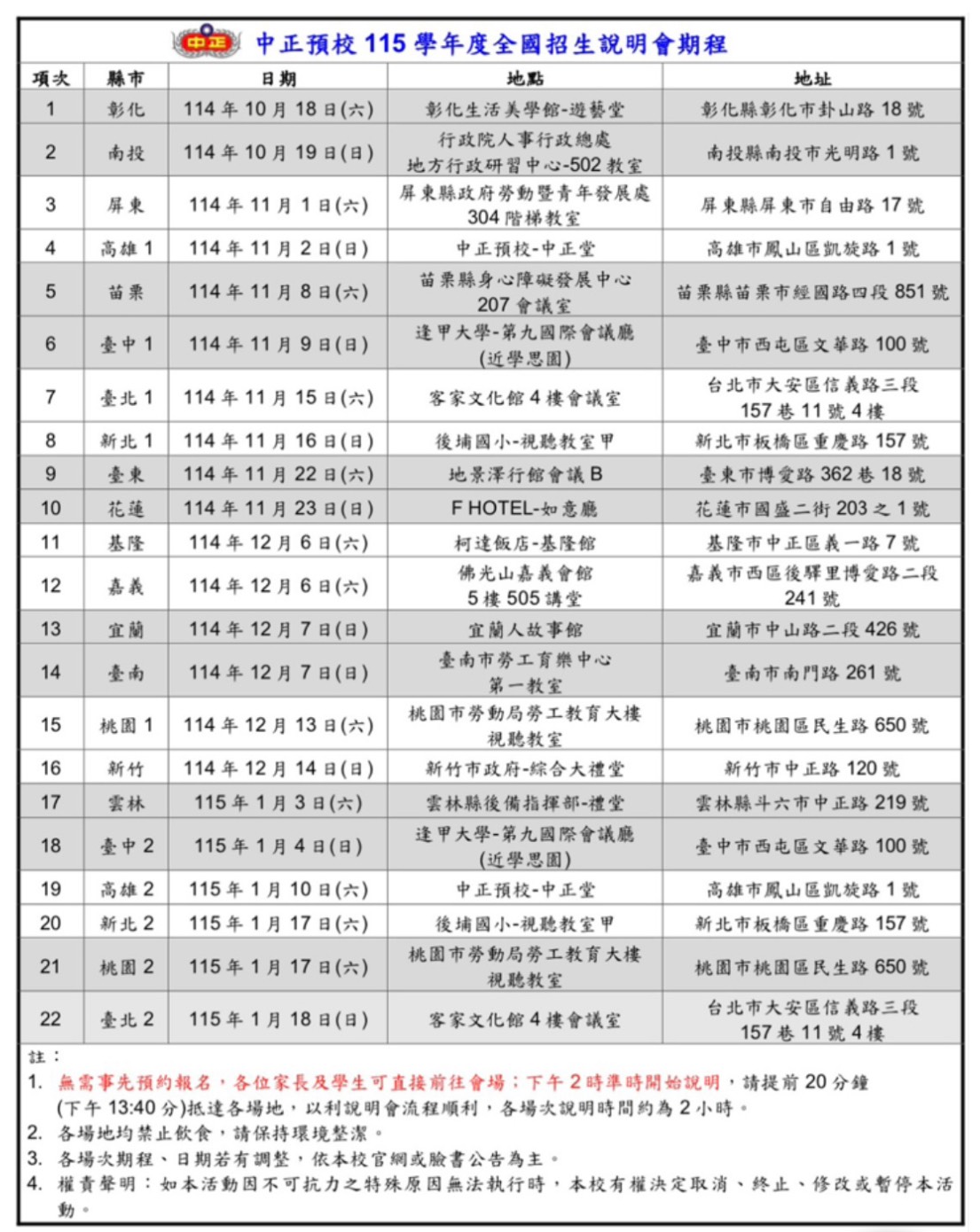 中正預校 115 學年度招生說明會 詳如附件 請參考 預告 : 日期 :114/10/18(六) 地點 :彰化生活美學館(遊藝堂)彰化縣彰化市卦山路18號 時間 :下午2:00