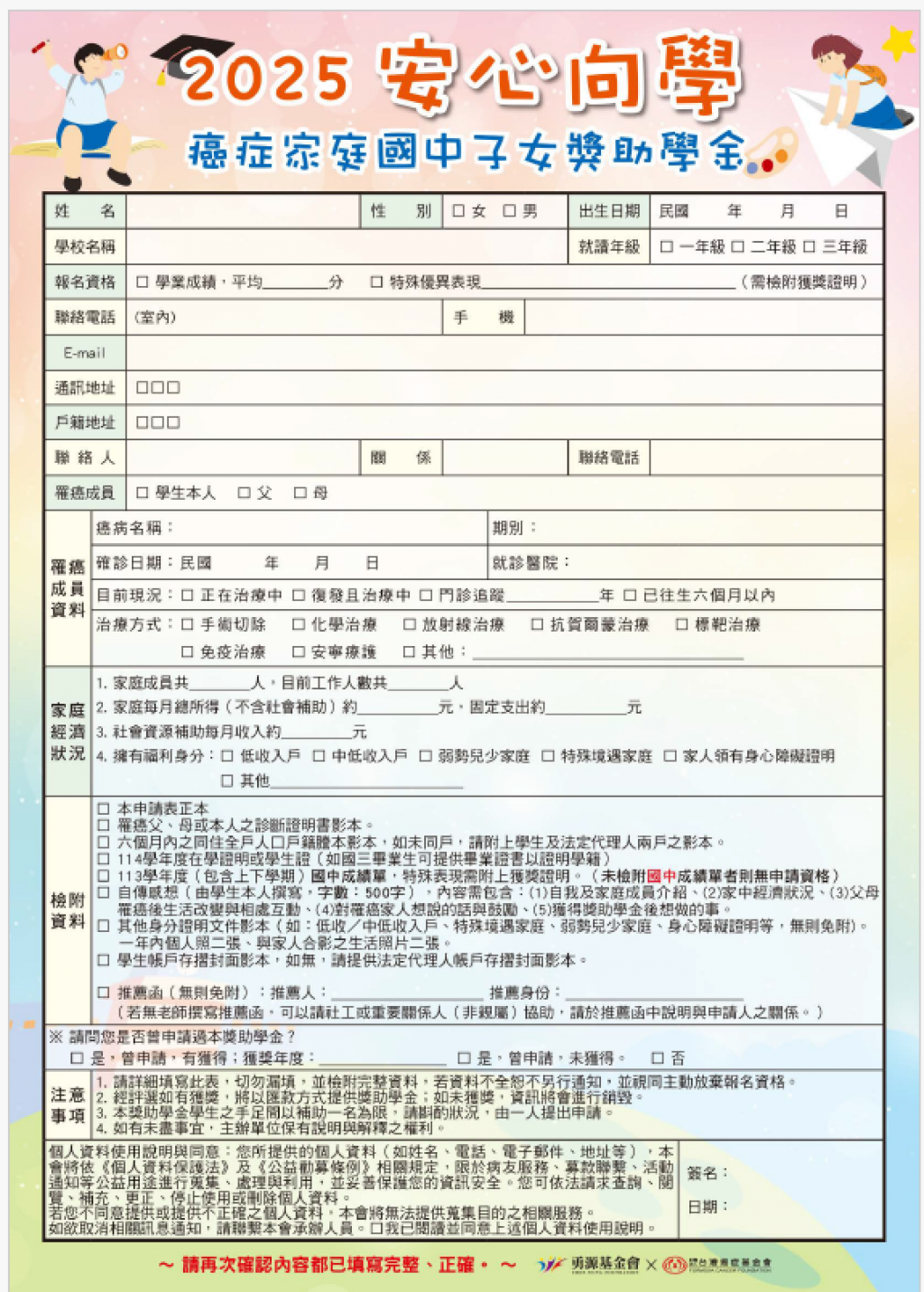 2、掛號郵寄:至台灣癌症基金會官網「最新消息」下載 申請表,填寫完整連同檢附資料寄至105台北市南京東路五段16號5樓之2,並註明「2025 安心向學-癌症家庭國中子女獎助學金活動小組收」。