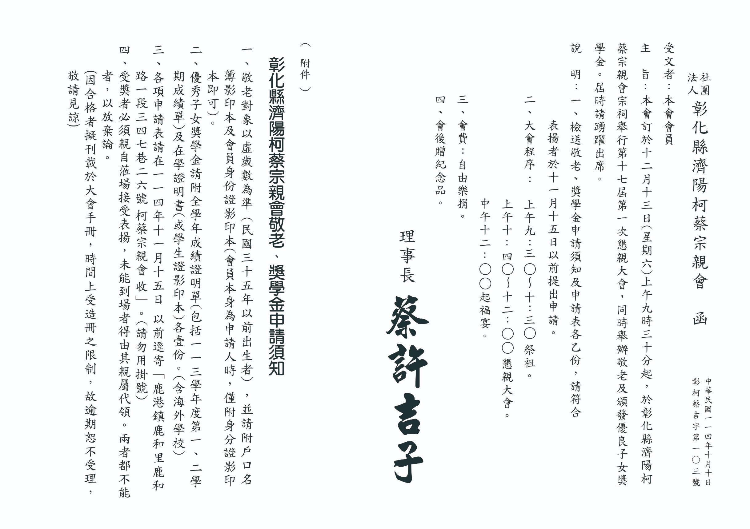 請符合資格者(113年度有繳費者)準備相關資料文件於11月15日之前 自行向彰化縣濟陽柯蔡宗親會提出申請,申請辦法詳如附件。