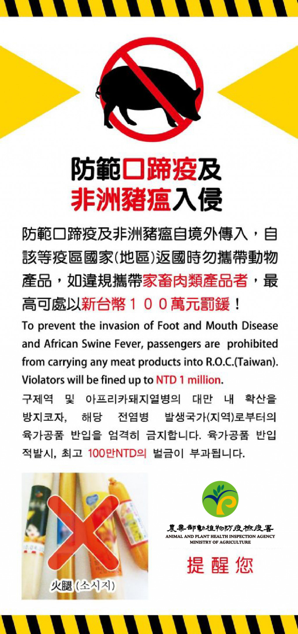 一、請員工同仁、師生及家長注意,旅客出入國境,禁止攜帶肉品或肉製品入境,以免觸法,也避免疫情傳入;詳情請瀏覽非洲豬瘟資訊專區(https://asf.aphia.gov.tw/index.php)或參閱附件說明。