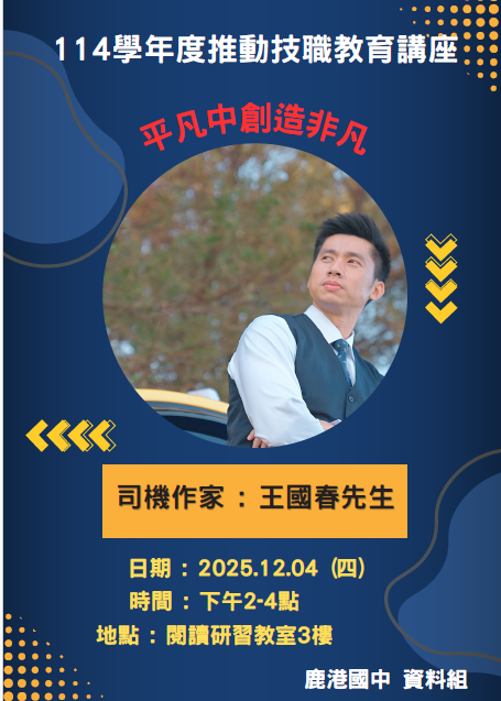 114 學年度技職教育講座 邀請司機作家-王國春先生 主題 : 平凡中見不平凡 日期 : 114/12/04(四) 地點 : 閱讀研習教室3樓 (國文科樓上) 時間:下午2-4點 參與班級 :304、307、315班 歡迎有空的老師們一同聆聽