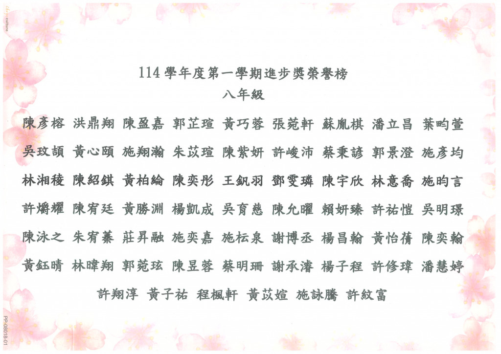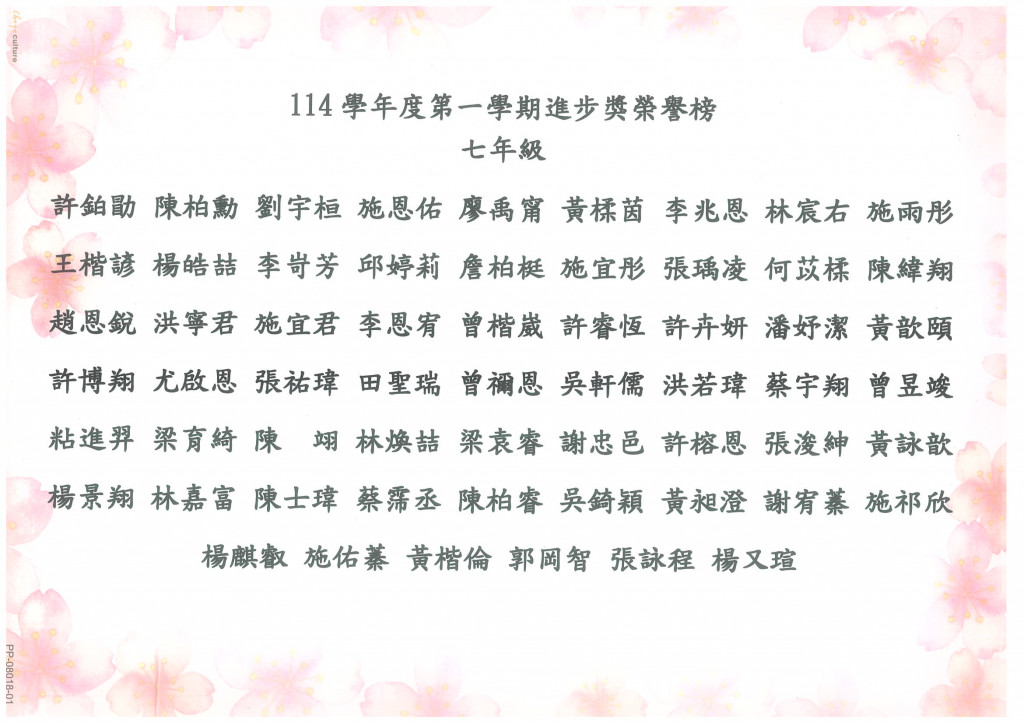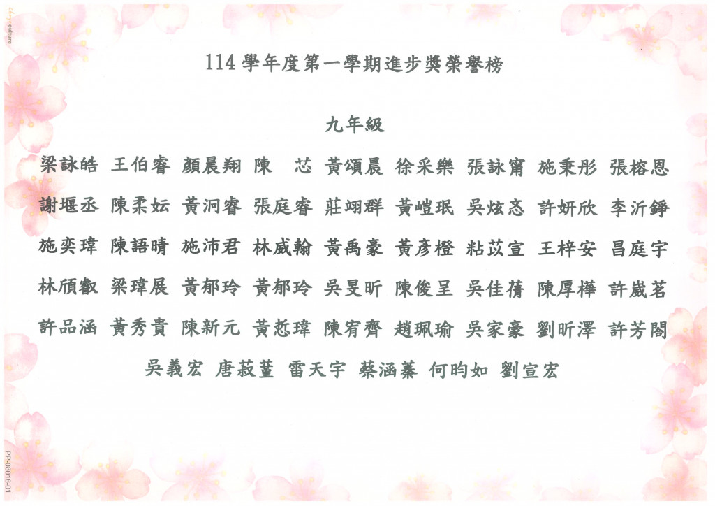 114學年度第一學期段考進步獎獲獎名單,如附件。
