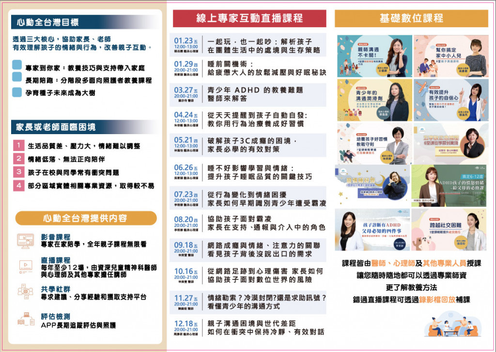 二、本方案課程由兒童心智科醫師、臨床心理師、職能治療師等專家群共同規劃數位影音課程、專家直播課程等,詳如附件。