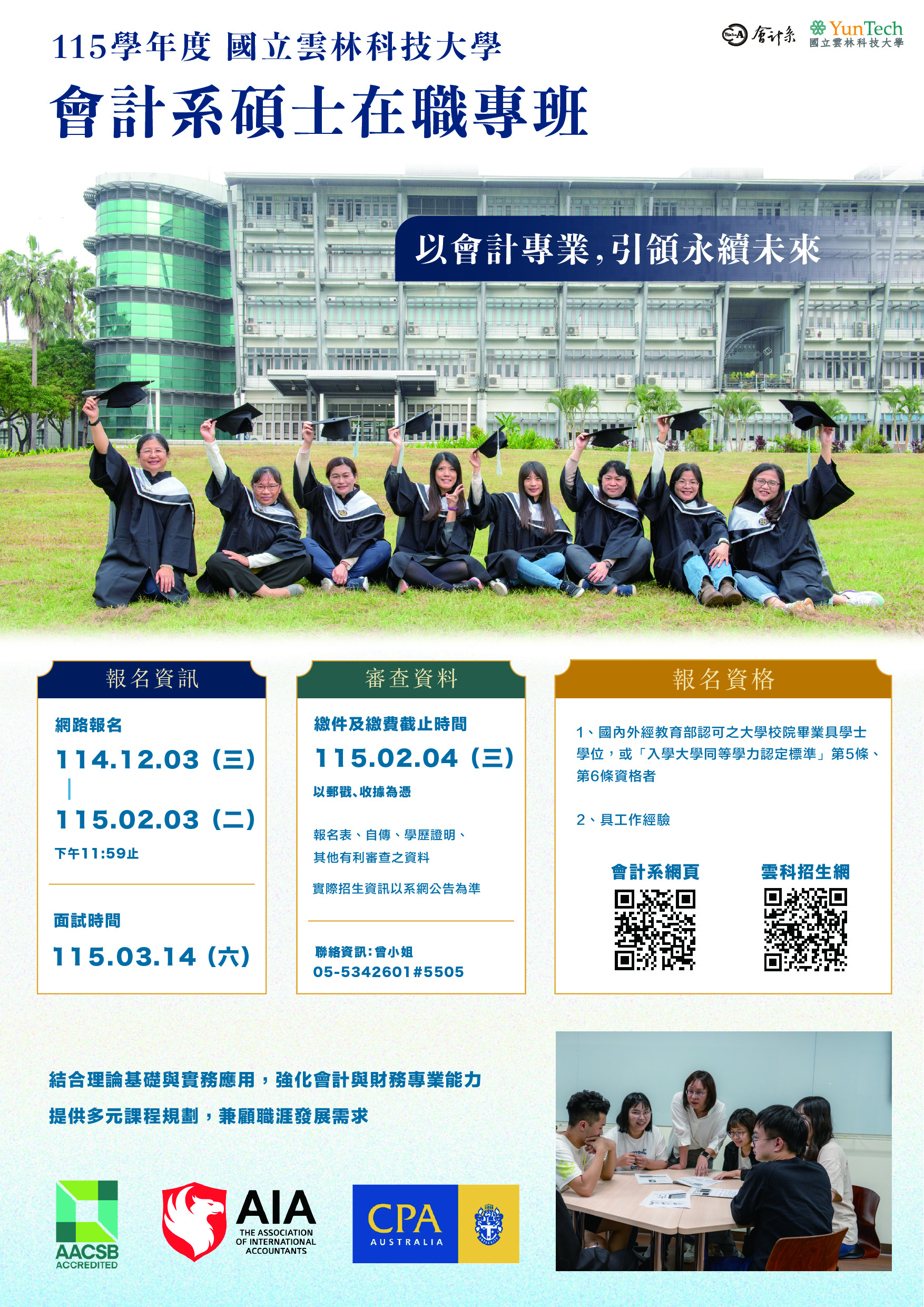 | 一、 | 該校會計系碩士在職專班招生網路報名時間:即日起至115年2月3日(二)下午11時59分止(一律採網路報名)。簡章下載及報名網址:https://examweb.yuntech.edu.tw/WebExams/Exam_W/ |