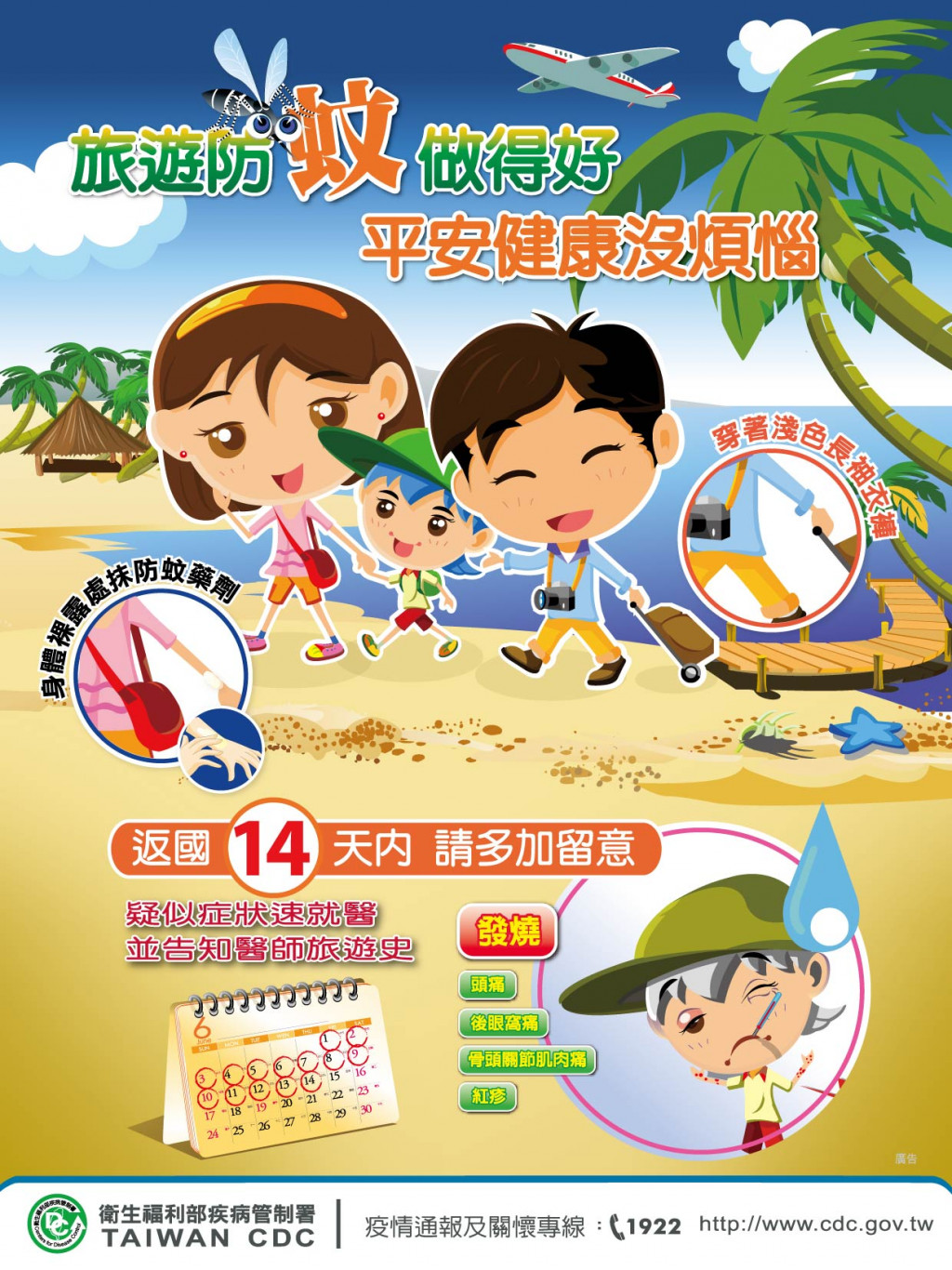 請於旅遊時做好防蚊措施、自流行國家返國後應自主健康監測14天,