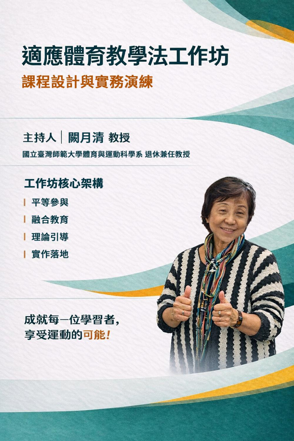 (四) 活動內容:本活動由講師結合相關理論模式,說明適應體育之課程設計與教學法,並透過實作引導學員將理論實際應用於課程活動中。