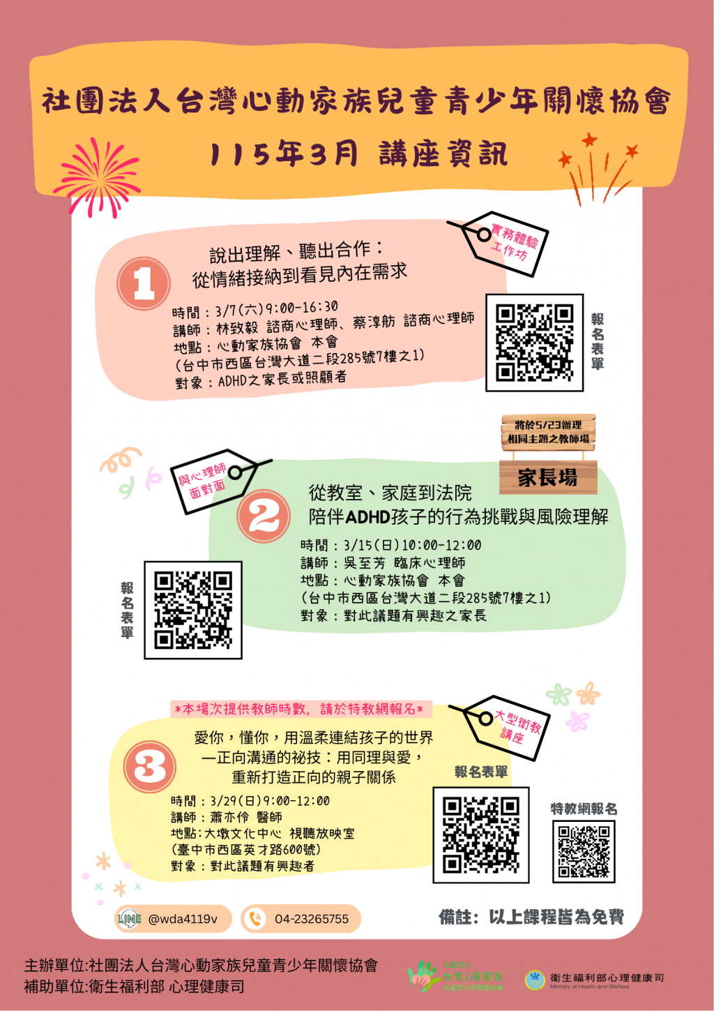 一、本會長期關注注意力不足過動症(ADHD)兒童青少年之心理健康與人際適應議題,規劃辦理一系列免費之教師研習及家長教育活動。