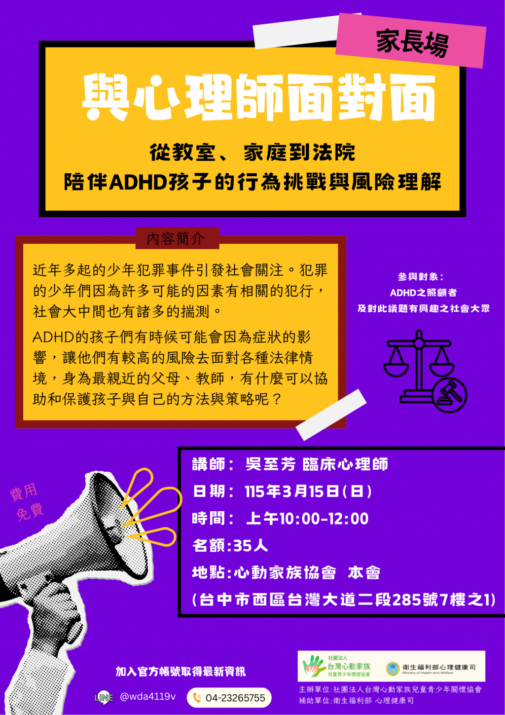 主題:從教室、家庭到法院-陪伴ADHD孩子的行為挑戰與風險理解
