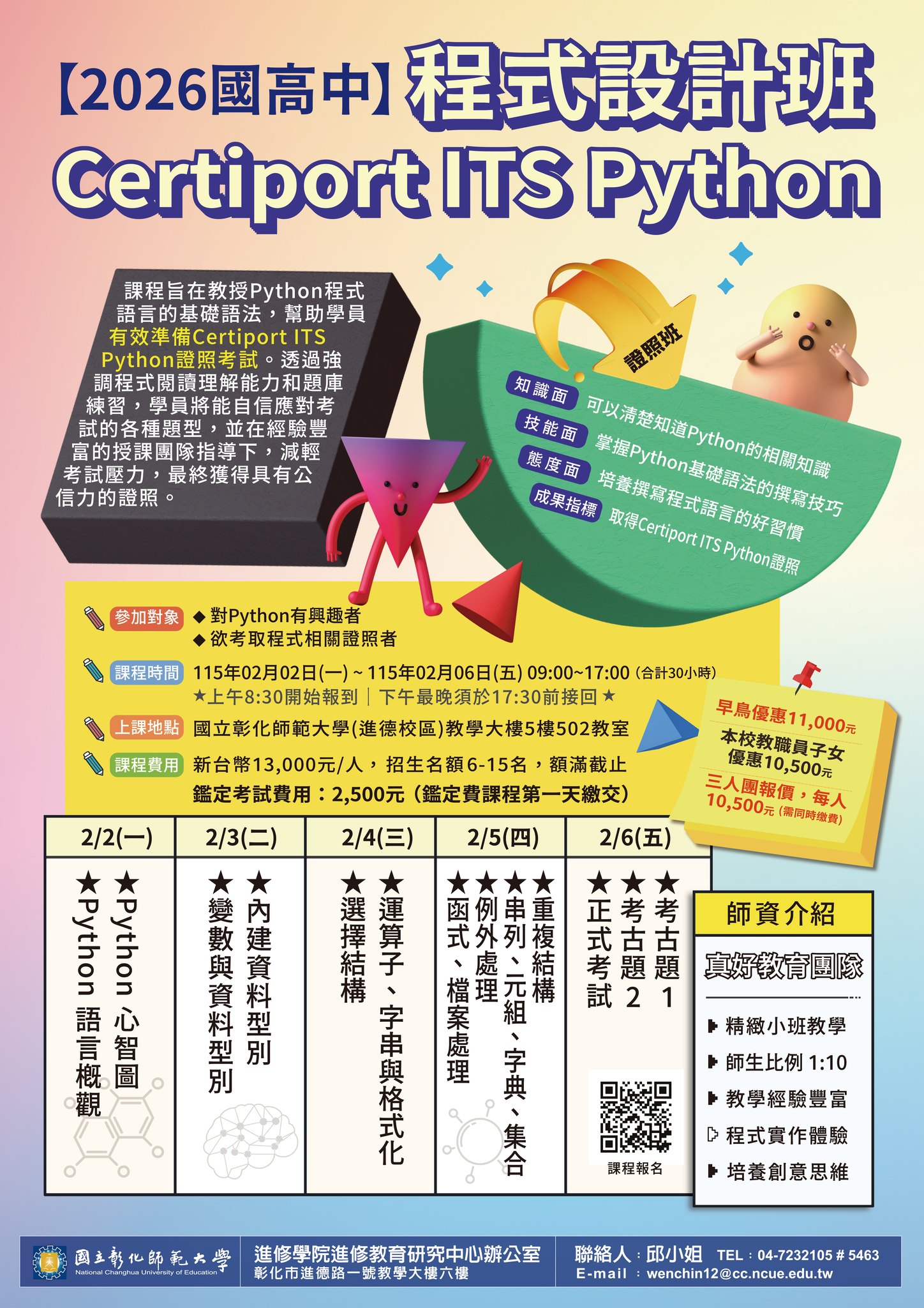 【程式設計班】邱 小 姐:04-7232105 分 機 5463 , E-mail :wenchin12@cc.ncue.edu.tw。 |