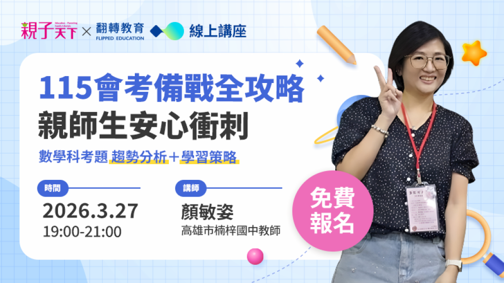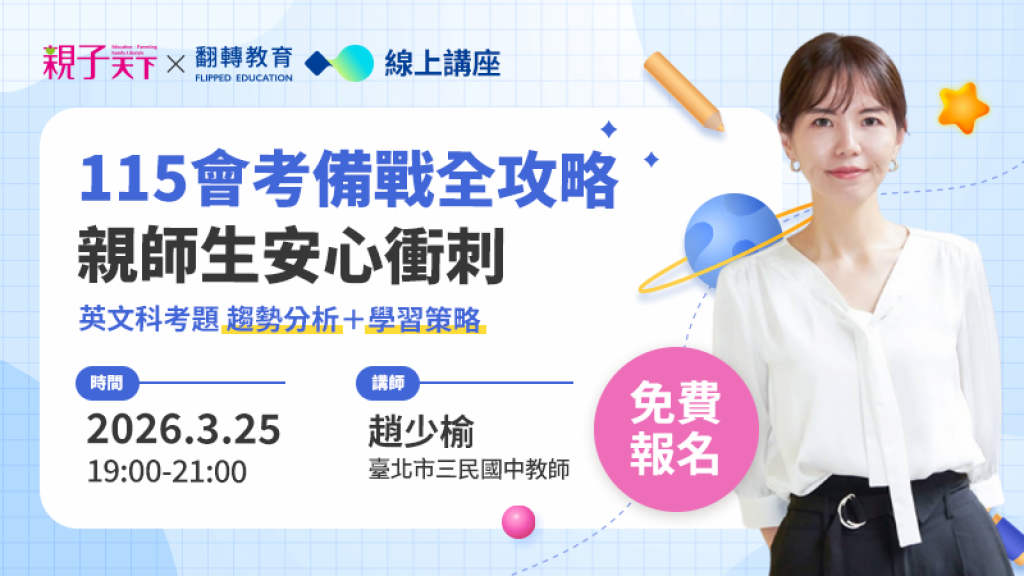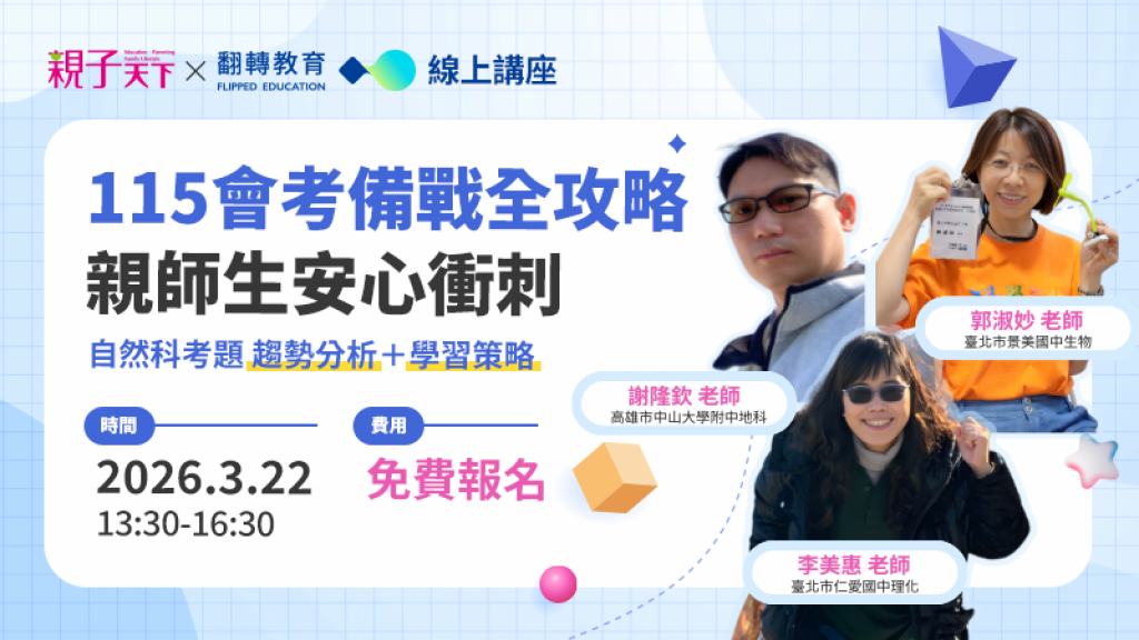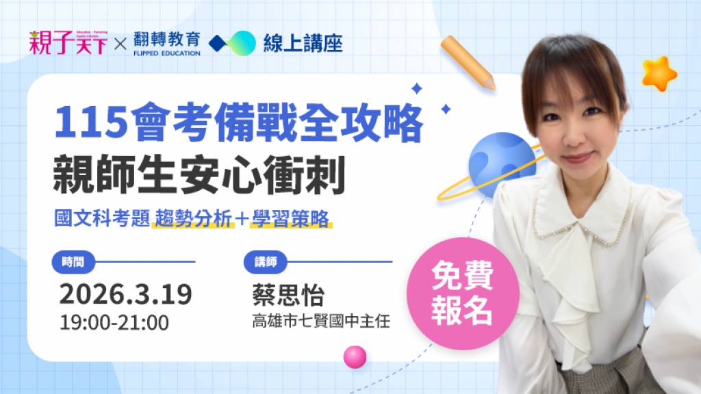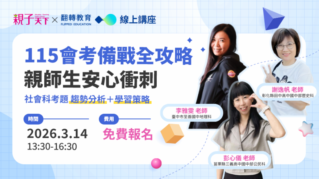 | 一、 | 為協助全國國中學生及家長掌握115年國中教育會考命題趨勢與備考重點,親子天下翻轉教育平台規劃辦理「115會考備戰全攻略」系列線上講座,活動期間為 115年3月14日至3月27日,針對國文、英文、數學、社會、自然等科目進行考題趨勢解析與考前衝刺策略說明,提供學生明確備考方向與實用應試建議。 |