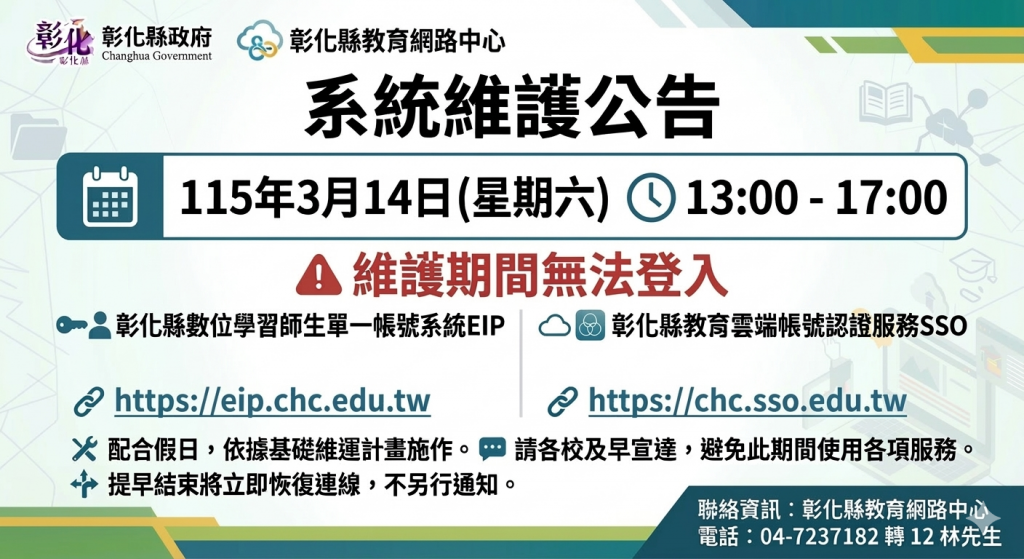 二、旨揭辦理系統維護作業,將肇生「彰化縣數位學習師生單一帳號系統EIP」及「彰化縣教育雲端帳號認證服務SSO」無法登入之情形,爰特別安排於假日期間115年3月14日(星期六)13時-17時施作,惟仍請受影響學校及早宣達週知,避開施作期間使用各項服務。