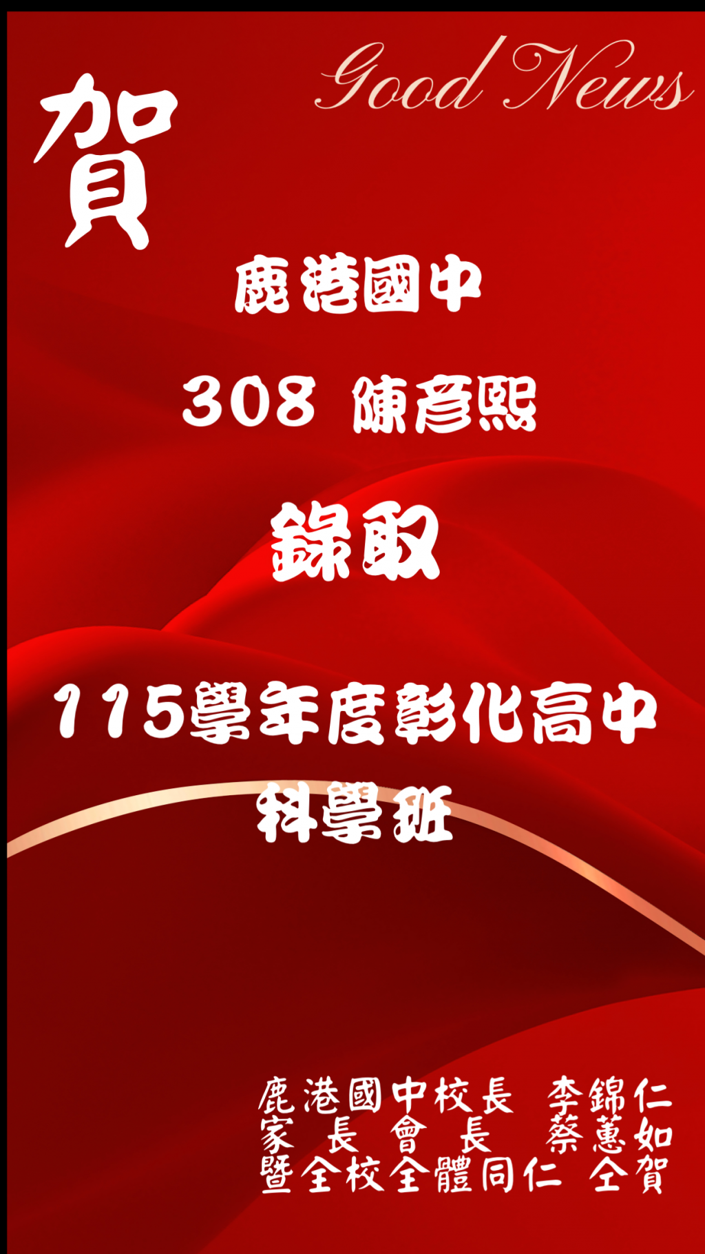 恭喜 308 班陳彥熙同學錄取彰中科學班!