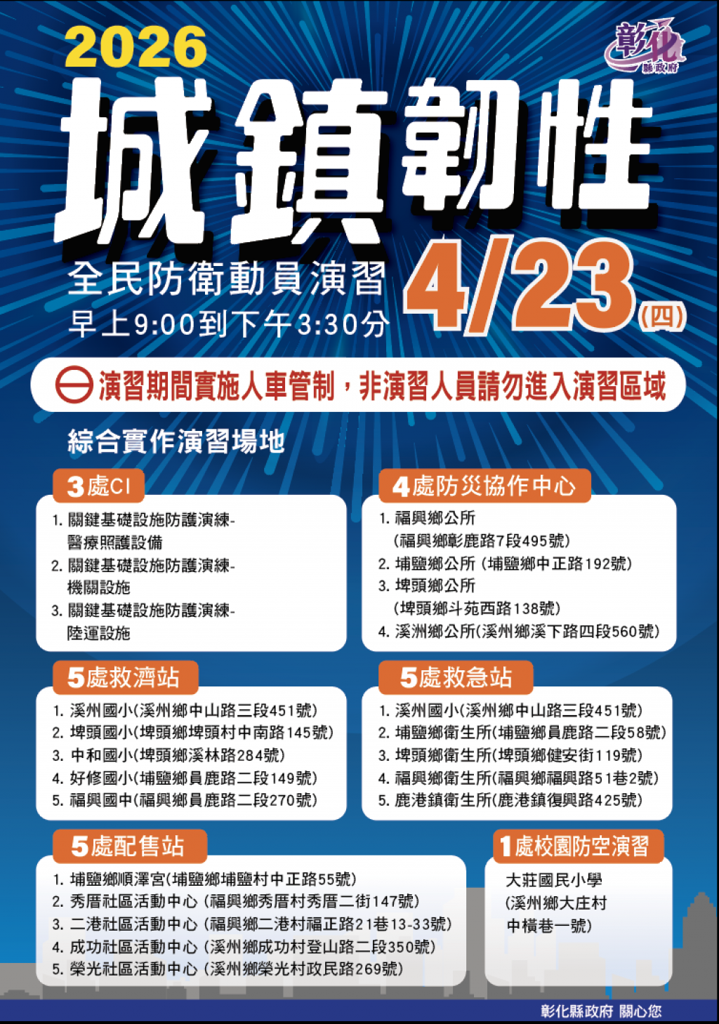 彰化縣政府謹訂於115年4月23日於福興鄕埔鹽鄕埤頭溪州鄕等,辦理彰化縣2026城鎮韌性演習
