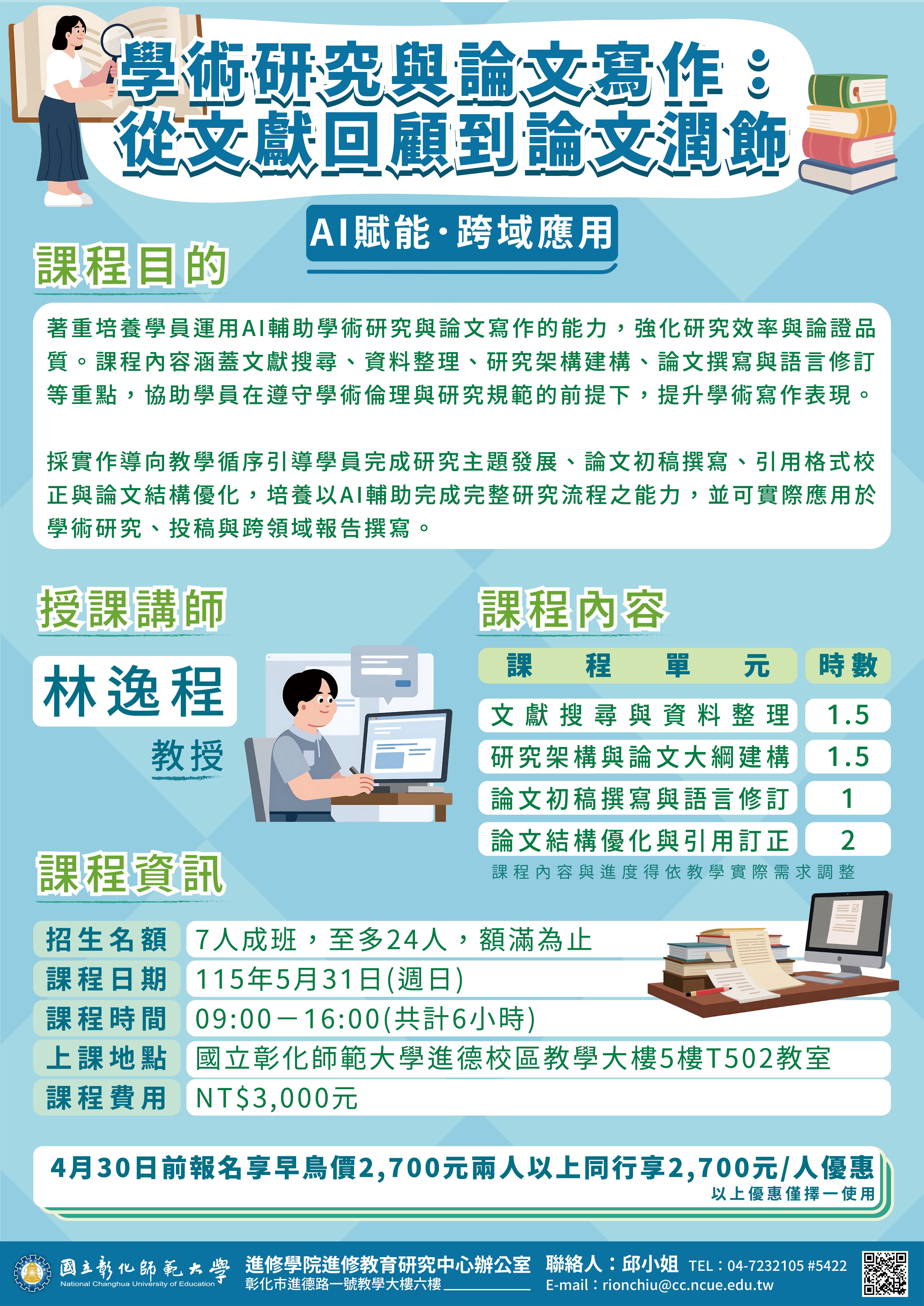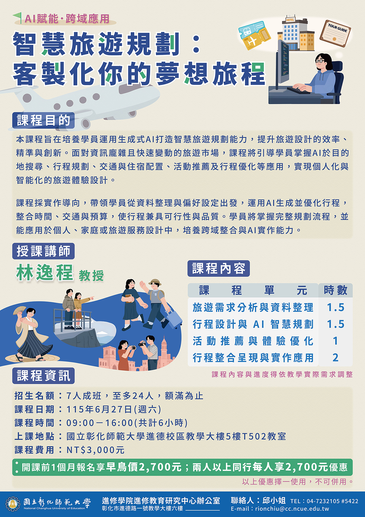 檢送國立彰化師範大學進修學院推廣教育課程「【AI賦能.跨域應用】 學術研究與論文寫作:從文獻回顧到論文潤飾」、「【AI賦能.跨域應用】 智慧旅遊規劃:客製化你的夢想旅程」、「【AI賦能.跨域應用】 行政與職場生產力:打造你的數位秘書」課程簡章。