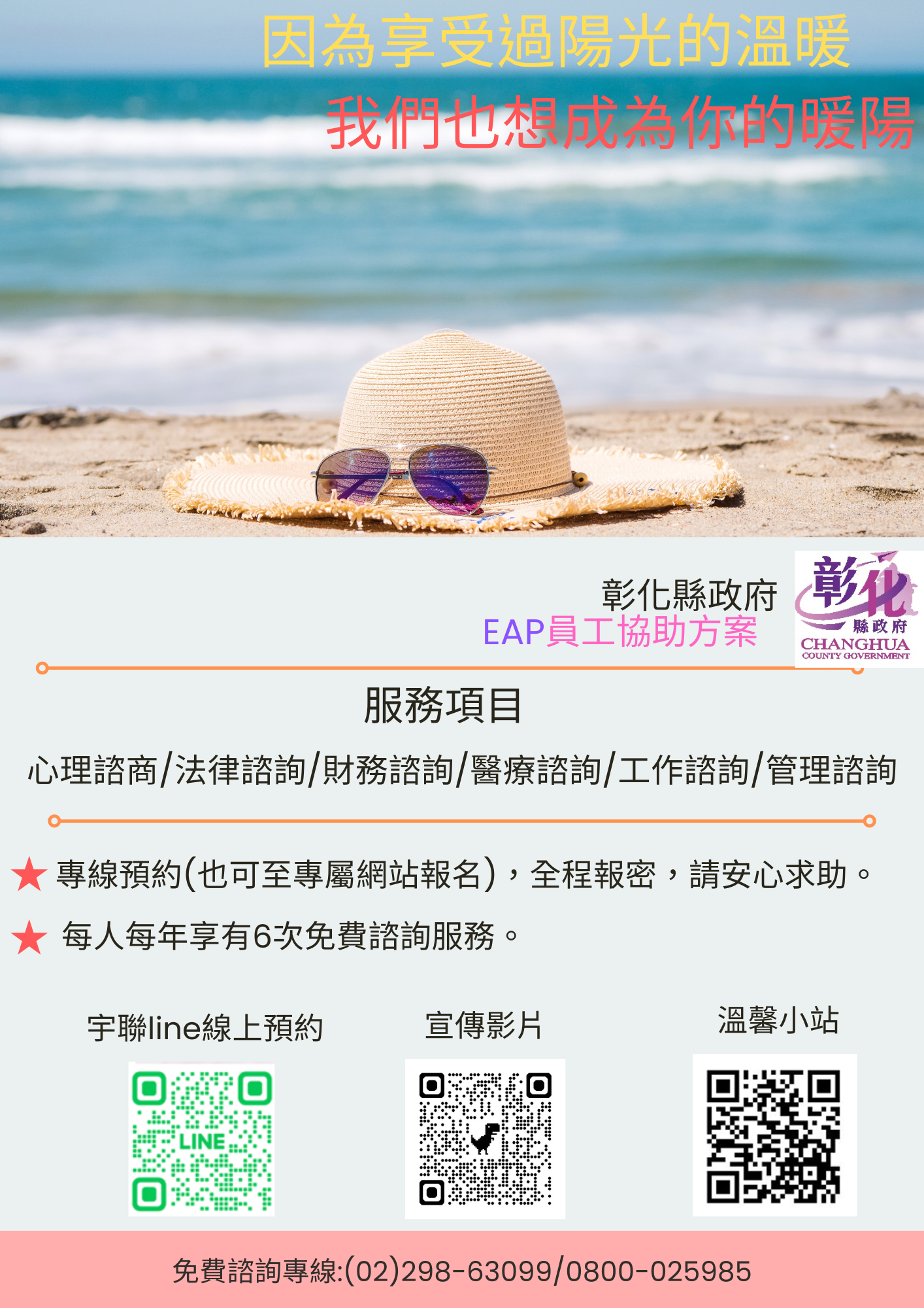 | 一、 | 縣府115年委託專業機構宇聯管理顧問有限公司,提供心理、醫療、財務、法律、工作及組織管理等六大面向專業諮詢服務。同仁如有使用需求可撥打EAP專線(02-29863099、0800-025985) 、透過溫馨小站(https://sites.google.com/view/changhuaeap)預約或由縣府人事處EAP窗口協助(04-7531412)。 |